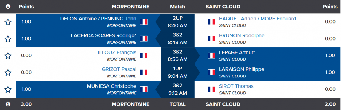 Le duel a tenu ses promesses, avec des matchs accrochés et intenses. Philippe Laraison s’impose 1 up au terme d’un simple très disputé, tandis qu’Arthur Lepage apporte également un point grâce à une victoire maîtrisée 3&2. Malgré ces belles performances, Saint-Cloud s’incline finalement sur le score de 3 à 2, Morfontaine remportant le foursome et deux simples serrés.