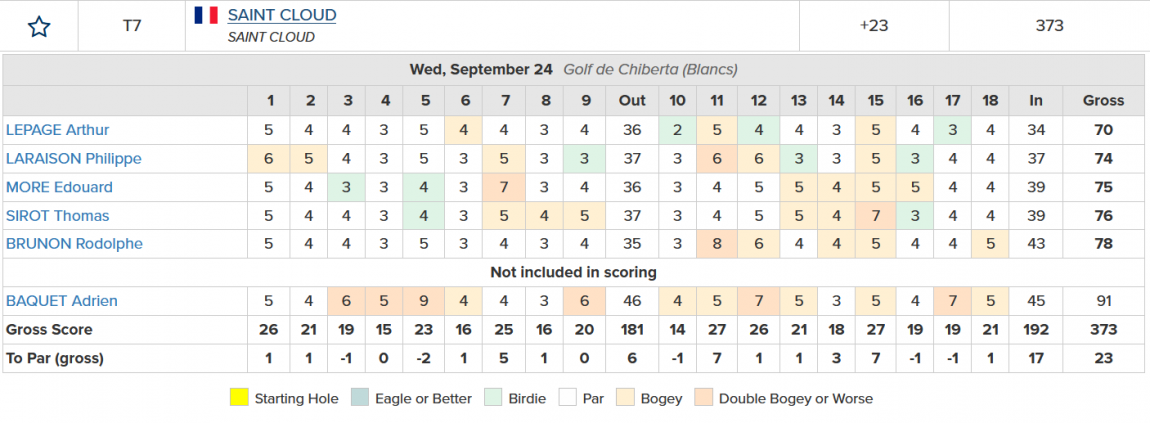 Arthur Lepage (70, 70) a été l’un des artisans de cette performance, bien épaulé par Rodolphe Brunon (73, 73), Philippe Laraison (74, 76), Thomas Sirot (76, 77) et Édouard More (75, 79). Grâce à cette régularité collective, Saint-Cloud intègre le top 8 et s’offre le droit de disputer les quarts de finale.