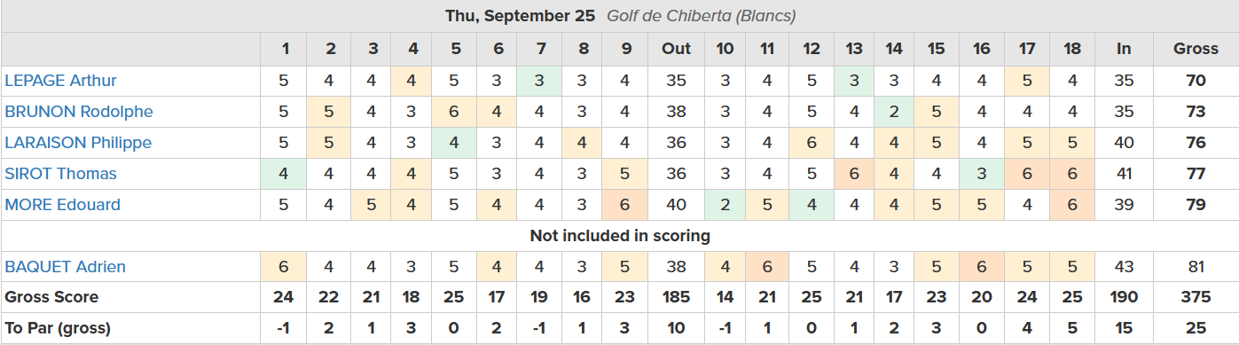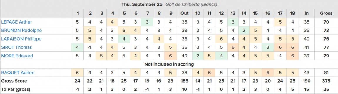 Arthur Lepage signe la meilleure carte de l’équipe avec un solide 70 (-2), bien accompagné par Philippe Laraison (74), Edouard More (75), Thomas Sirot (76) et Rodolphe Brunon (78). Adrien Baquet, non retenu au décompte, ramène un 91.